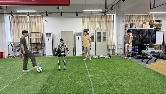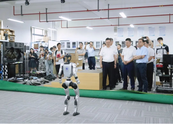 牵头建设,联合宇树科技、禾川股份等11家领军企业共同组建,入选第八批省协同创新中心。学院院长李秦川教授向区领导作了专题汇报,他从学院学科基础、中心建设概况、人形机器人核心技术攻关及阶段性成果三方面进行了系统介绍。调研组现场观摩了人形机器人演示,机器人精准流畅地完成了拟人化足球运动控制,生动展示了拟人舞蹈和武术动作,其灵活性与稳定性赢得了在场人员的赞赏。