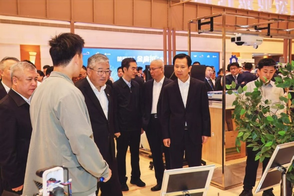 在展馆现场,团队研究生向农业农村部“金扁担”产业工程的专家团作了生动详实的介绍,全面展示了两款机器人的设计理念与作业性能。林熙淼与何津立同学结合现场动态演示,详细讲解了番茄采摘打叶机器人如何依托多任务视觉系统与灵巧机械臂,在温室密集种植环境中实现“识得准、摘得稳、不损伤”的精准作业。潘麟与谭嘉磊同学讲解了丘陵山地采摘机器人在全地形底盘与模块化末端执行器方面的技术特点,展示出该机器人在复杂地形实现果园智能管理的可行性和应用前景。精准的作业演示与深入的技术剖析赢得了专家团和领导们的高度评价。