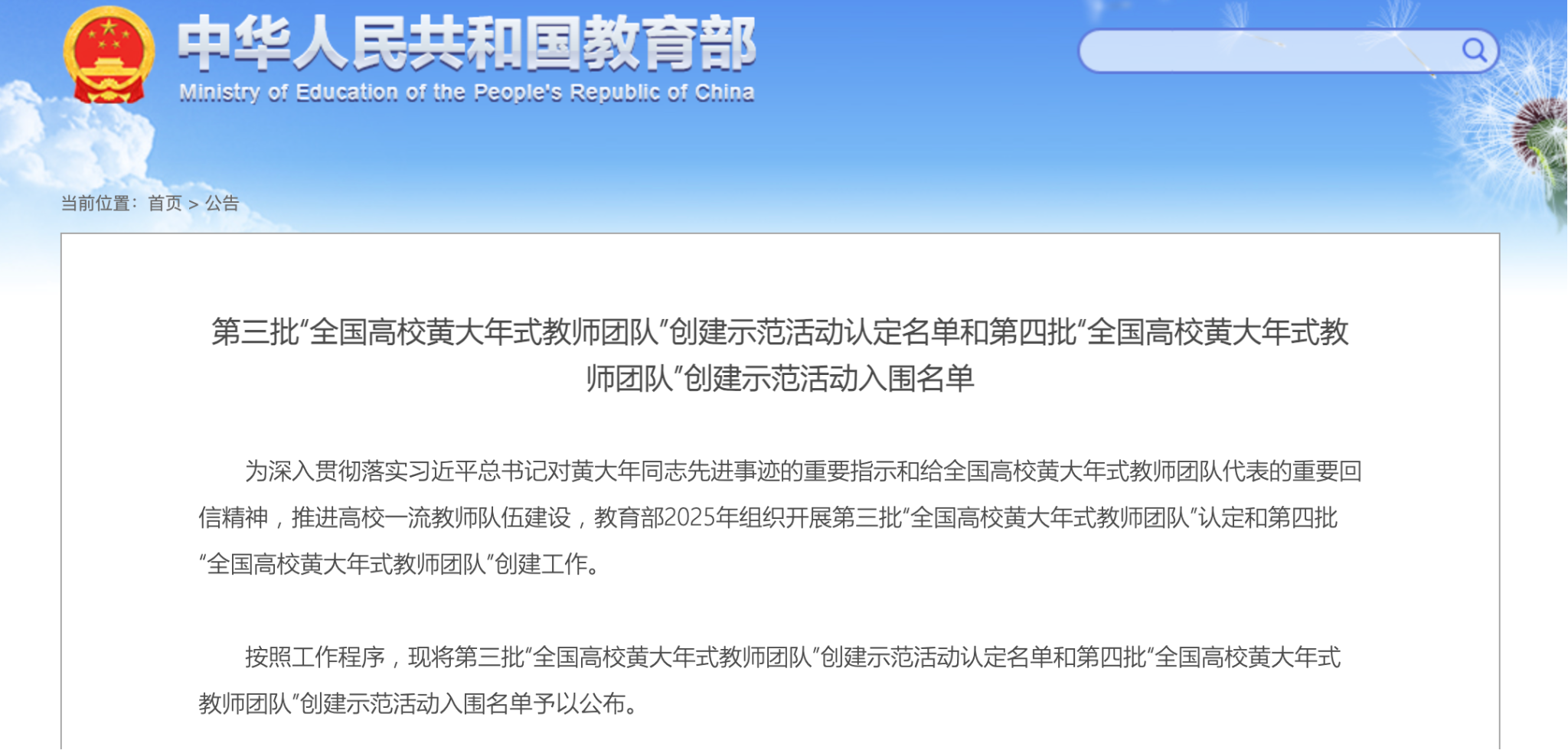 第四批“全国高校黄大年式教师团队”创建示范活动入围名单